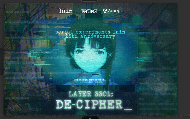Pour les 25 ans de la série animée Serial Experiments Lain, les ayant droits organisent un ARG (jeu en réalité alternée) nommé Layer 3301: De-Cipher_.