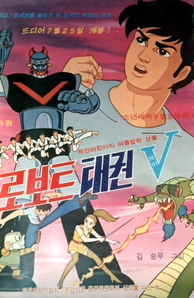 Aujourd'hui, je signale que le film d'animation sud-coréen "Robot Taekwon V", réalisé en 1976 par Kim Cheong-gi, est dispo (depuis aujourd'hui toujours) sur Youtube, en version remasterisée 4K, gratuitement donc, et même avec des sous-titres anglais.