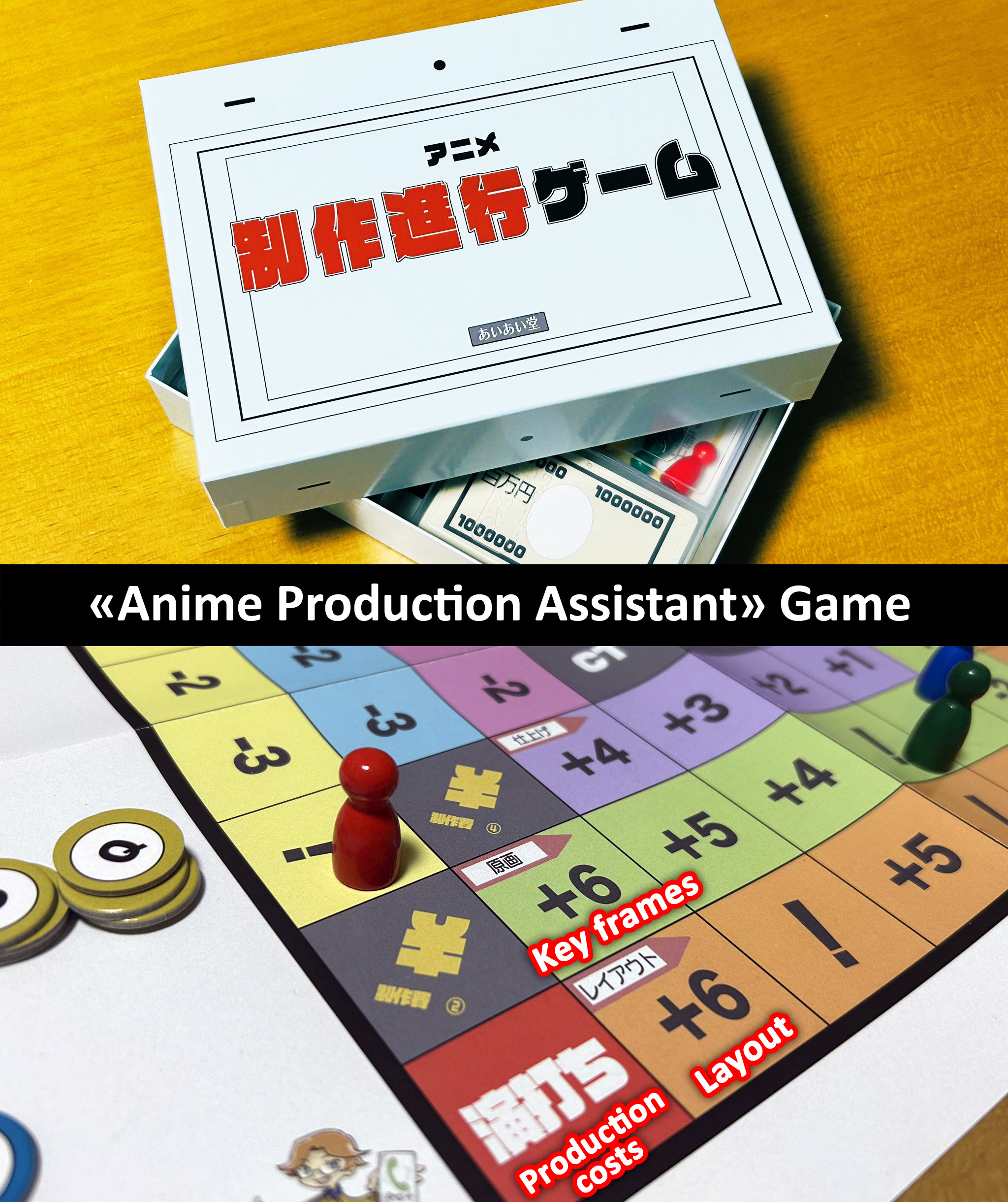 "Anime Production Assistant" (アニメ制作進行ゲーム) est un jeu de société complètement indé, développé et commercialisé (en festivals tout aussi indés) par le japonais surnommé Aiaido.