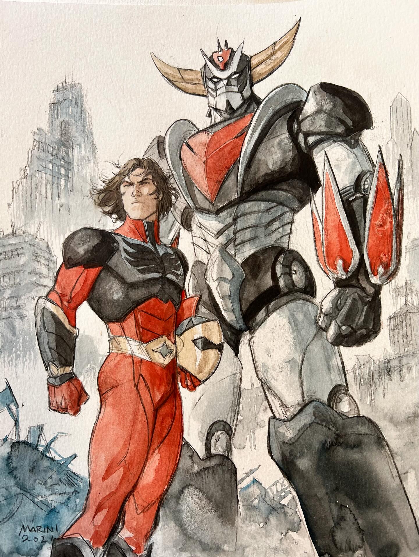 Si j'ai un peu décroché de ses récentes publications BD, je reste fan de son art, et je ne résiste pas à l'envie de vous partager son récent fanart de Goldorak (Grendizer).
