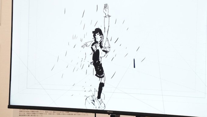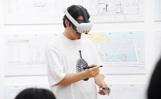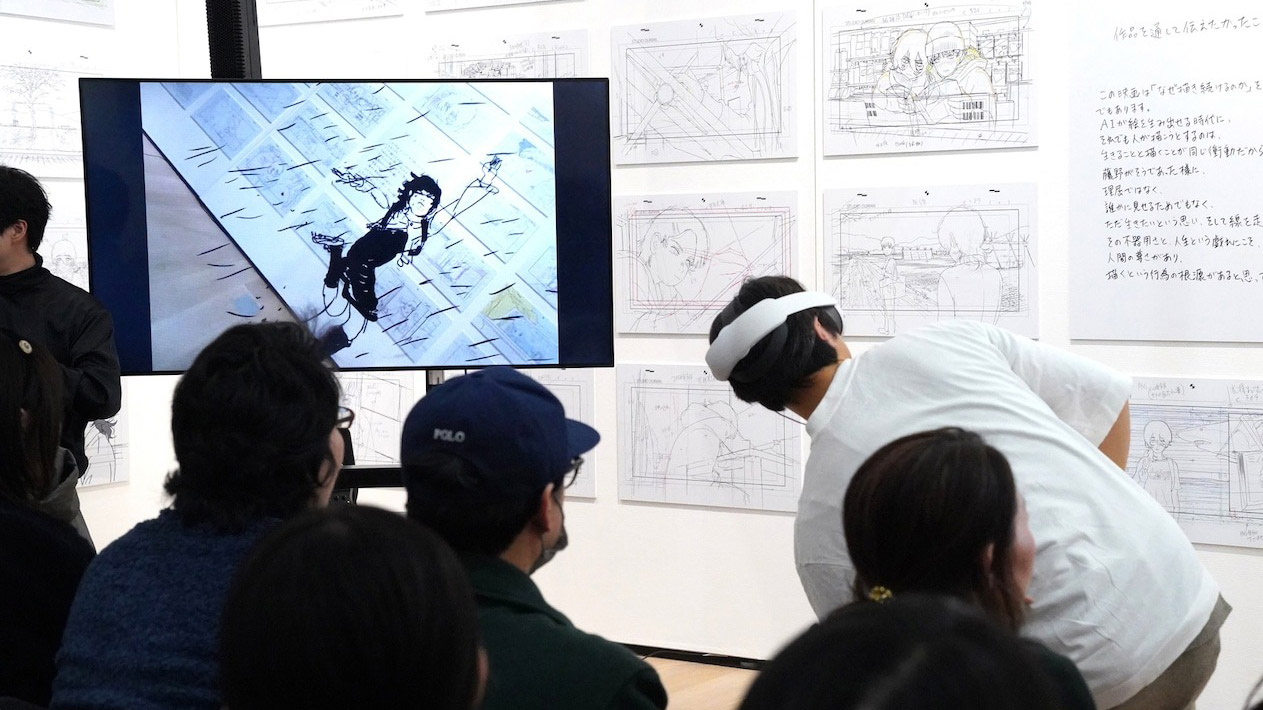Voici un aperçu avec quelques photos issues du vernissage, où Oshiyama a même donné une session de live drawing/animating en VR (de la scène où Fujino court sous la pluie, voir plus bas).