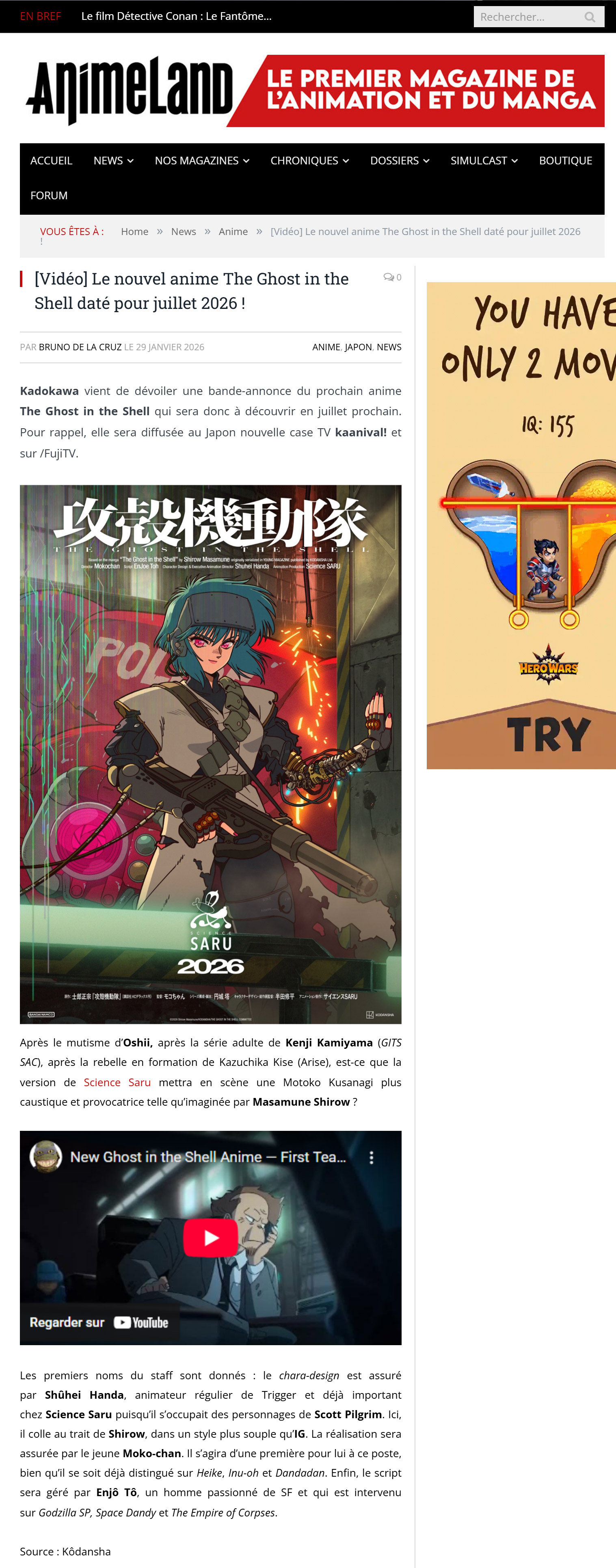 Premier teaser (avec images qui bougent) mis en ligne à l'instant pour "The Ghost In The Shell", la nouvelle série animée dérivée de l'oeuvre de Masamune Shirow, cette fois produite par le studio Science Saru, avec notamment Mokochan à la réalisation, et Shuhei Handa en character designer / superviseur animation.